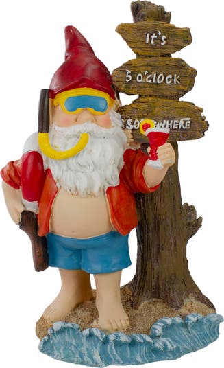 This gnome is ready for the beach. He has his goggles, snorkel, flippers, flotation ring, and last but not least his ice-cold tropical drink. As the sign says "It's 5 o'clock somewhere". This fun garden statue will make a great addition to your backyard, front yard, garden, porch or to add a little fun to your indoor space. Product Features: Beach gnome outdoor garden statue Features a wooden tree sign that says "It's 5 o'clock somewhere" He's wearing goggles and snorkel while carrying flippers, flotation ring and tropical drink Perfect for patio or garden Recommended for indoor or outdoor use Dimensions: 10.5"H x 7"W x 5"D Material(s): polyresin