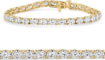 This classic women's bracelet features oval cut lab grown diamonds. All diamonds are prong set in a 14k yellow gold mounting. The bracelet features a double lock for security and durability. The mounting has good flex and beautiful enough to wear every day.