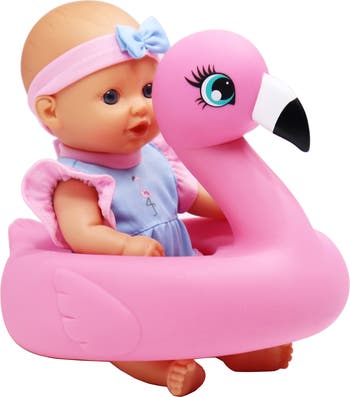 - ADORABE FLAMINGO FLOATIE: Dressed in a colorful outfit and flamingo floatie, this baby doll is designed for bathtime fun, adding an extra splash of excitement to water play.