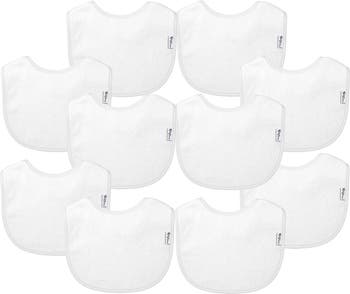 This 10-pack of infant bibs is made from a supersoft cotton blend with a waterproof layer to keep baby dry and comfortable from drips and drools.