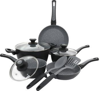 The Oster 10 Piece Non-Stick Aluminum Cookware Set in Black and Grey Speckle contains everything you need for a full kitchen collection of your basic essentials. Each pot and pan is crafted from heavy gauges, forged aluminum for a sturdy and long lasting design. This set also comes with paired tempered glass lids and two handy nylon kitchen tools to aid you in your cooking endeavors. Hand wash this set in order to maintain its quality for years to come.