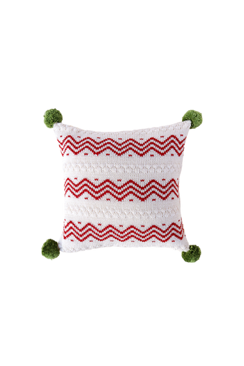 This knit holiday throw pillow brings a touch of festive charm to your home decor with its modern red and white zigzag pattern. The intricate knit design, paired with soft green pom-poms on each corner, adds a playful yet classic element to any room. Crafted from high-quality cotton yarn, this pillow adds a cozy, seasonal flair to any room. Whether placed on a couch, chair, or bed, its vibrant colors and unique design are sure to catch the eye and bring holiday cheer to your space.