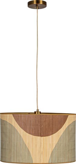 This Circles of Harmony Pendant Lamp is a symphony of design and function. The natural material, shaped into an organic form, is adorned with a multi-colored circle pattern that adds a playful yet sophisticated touch. The gold canopy enhances its luxurious appeal, while the 8-foot cord ensures it can be placed just where it's needed. Designed for hardwiring, the lamp includes a plug switch for easy operation. It requires one E26 bulb to cast a warm, inviting light throughout the room. Measuring 19.25 inches long, 14.25 inches wide, and 12 inches high, this pendant lamp is not just a source of light but a centerpiece that complements any decor.