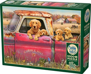 Cobble Hill Farm just got cuter! An adorable pack of pups and momma dog await their ride in the rusty vintage truck. The birds and butterflies curiously watch the excitement in this 1000 piece puzzle, painted by Cobble Hill's most popular artist Greg Giordano. Cobble Hill puzzles are manufactured using the finest inks, premium grade blue board, linen paper, and the most endearing images. Our puzzles feature interesting random-shaped pieces - which are a departure from the more traditional predictable pieces found in most puzzles. No two pieces are alike. We also include a handy poster, making it easier for multiple people to work on the puzzle at the same time. We use quality linen print paper that gives the puzzle a luxurious look and feel. Not only does it look elegant, but it also works to reduce the glare by dispersing the light across the cross hatches much better than a smooth paper finish. We're environmentally friendly in that we use vegetable-based inks, and the cardboard is made from recycled material. Puzzles are sealed in shrink wrap. The box is thick and sturdy, so it can stand the test of time. The Cobble Hill Puzzle Company was founded in 2005 with a desire to bring quality puzzles with a loving, whimsical, and nostalgic feel to jigsaw puzzle enthusiasts and novices.