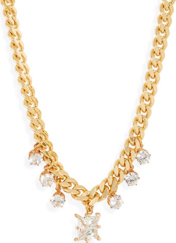 Twinkling crystal charms dangle from the chunky curb-link chain of this necklace plated in 18-karat gold.
