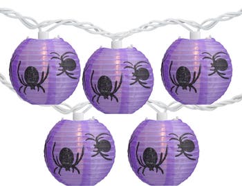 Illuminate your patio or porch with these paper lantern lights. This strand of clear mini lights has purple paper lantern covers with black spider designs. These lights will be the perfect addition to your Halloween party. The mini light will shine brightly through the lanterns, lighting up any space. Product Features: Purple and black spider Halloween paper lantern light set Color: clear bulbs / white wire Number of bulbs on string: 10 Bulb size: mini Bulb type: incandescent Spacing between each bulb: 12" Lighted length: 8.75' Total length: 11' 24" lead cord 5" tail cord Additional Product Features: Super bright bulbs UL certified and approved for indoor or outdoor use If one bulb burns out, the rest will stay lit Comes with replacement bulbs and spare fuses Contains end-to-end connectors which allows you to connect multiple sets together (not to exceed 210 watts) 120 volts, 60 hertz, .06 amps, 7.2 watts Lantern Dimensions: 3" high x 3" diameter Material(s): plastic/metal/paper
