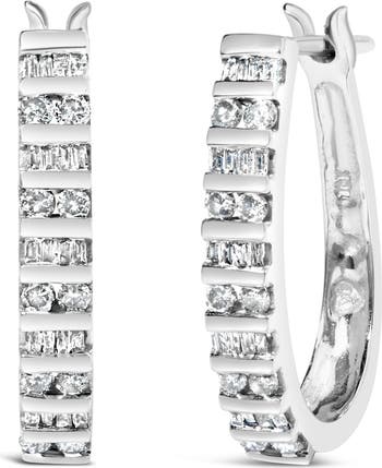 Immerse yourself in the sublime elegance of these exquisite hoop earrings, masterfully crafted from 10K gold and adorned with a total of 1.0 carat of natural diamonds. Each earpiece shimmers with a captivating dance of light, thanks to a meticulous alternating arrangement of round and baguette-cut diamonds that alternate along its graceful 'U' shape. These hoops boast enhanced brilliance and resilience, inviting admiration and envy in equal measure. The color grade of I-J and clarity of I2-I3 ensure a luminous glow that complements any ensemble, while the hinge back closure promises a secure and plush fit, making them perfect for both grand evenings and everyday elegance. Bathed in luxury, these earrings are not just accessories but a celebration of craftsmanship and style, designed to be treasured for generations.