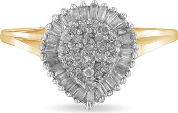 Elegant and timeless, this gorgeous 10K yellow gold diamond cocktail ring features 1/2 carat total weight of diamonds with a whopping 56 individual stones. The fashion ring features a domed pear-shaped cluster pavé set with round, brilliant cut white diamonds ensconced in a halo made up of rectangular, baguette cut diamonds. The floral cluster is centered on an asymmetrical tapered band that is remarkably slender. The cathedral style ring has a decorative openwork cutout gallery. This classic, feminine cocktail ring makes a great gift for any special occasion! Whether worn for daytime glamour or evening sparkle, this cocktail ring is gorgeously versatile. Give her a gift that will perfectly complement her favorite ensemble.