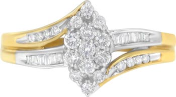 Crafted in lustrous 10k gold, this bypass ring showcases a dazzling round diamond cluster. Soft alternating yellow and white gold ribbons split from the ring band and surround the cluster. Round and baguette cut diamonds inlay the ribbons. A 1/2 Carat TDW of diamonds give this ring an unique and eye catching design.