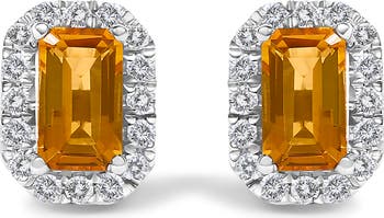 Envelop yourself in the luxury of these enchanting stud earrings, beautifully crafted in your choice of 10K yellow or white gold. At the heart of each pair rests a vivid 5x3 mm emerald cut natural gemstone, offered in either the rich green glow of an oiled natural emerald or the warm radiance of a color enhanced natural orange citrine. Each center stone is framed by a halo of resplendent natural diamonds totaling 1/7 cttw, celebrated for their I J color and I1 I2 clarity, adding a captivating sparkle to every angle. Designed in an elegant octagonal silhouette and secured with comfortable push back closures, these earrings bring refined craftsmanship and timeless sophistication to any ensemble. Whether chosen for their vibrant color or their enduring beauty, they are a stunning tribute to the allure of natural gems.