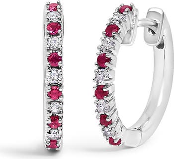 Captivate the senses with these exquisite 10K gold earrings, where each piece delicately balances the scintillating brilliance of natural white diamonds against the deep, passionate hues of round, prong-set natural rubies. Secured with a hinge back for comfort, these Huggy Hoop earrings are a symphony of elegance and vibrancy. The alternating gemstones are masterfully set along a sleek, single row, creating a mesmerizing trail of color and sparkle that dances in harmonious contrast. The diamonds, with their I-J color and I1-I2 clarity, twinkle with an innate fire, while the heat-treated rubies deepen the visual allure, each gem measuring a precise 1.4x1.4mm. This pair promises not only to add a touch of luxury to every ensemble but to become a cherished keepsake in any jewelry collection.