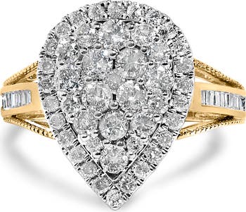 Dazzle and delight her with this stunning diamond cocktail ring. Crafted in cool in 10k yellow gold plated .925 sterling, this fancy-shape fashion ring showcases a sparkling a stunning total weight of 1 1/2 carat of diamonds wrapped in a pear-shaped frame of round diamonds. Additional channel set baguette diamonds line the shank for added shimmer. The luxurious charisma of these stunning, natural diamonds will catch the eye of every onlooker.