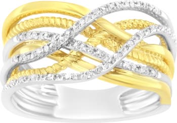 This unique 10k yellow gold plated and sterling silver ring design is lined with 1/10ct TDW of diamonds. Shimmering round cut diamond inlay silver ribbons that cross over yellow gold polished and roped ribbons. The contrast between the different colors and textures gives this bypass ring a eye catching design you will want to have.