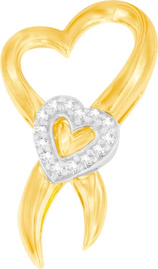 Certain to bring a smile on her face, this ribbon-shaped pendant features a heart accent in the center. The ribbon framing is crafted of 10 karats yellow gold, and the heart accent is adorned with ten karats white gold. Further, the lovely heart in the center is embellished with shimmering round cut diamonds, which makes it look more appealing. The intriguing design of this pendant will make her carry this jewel every day.