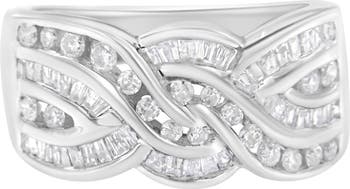 A unique women's diamond bypass ring with an intricate braided design of round and baguette diamonds. The ring is crafted in 14 karat white gold with a total diamond weight of 1 carat.