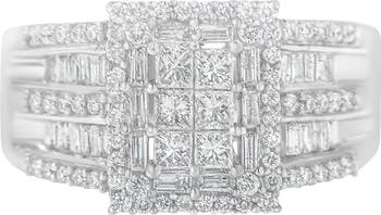 A diamond and gold cluster ring. The ring features 6 princess, 32 baguette, and 66 round diamonds together weighing 1 carat. They are set in a 10k white gold band.