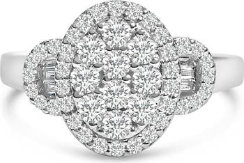 Discover the elegance of eras past with this exquisite 10K white gold statement ring, plated in gleaming rhodium to heighten its luminosity. Natural diamonds totaling 1.0 carats, boasting G-H color and SI1-SI2 clarity, are meticulously arranged to craft an entrancing oval cluster. This central motif is framed by a delicate halo and flanked by artful hints of trapezoid-like shapes, evoking the sophisticated geometry of Art Deco design. The ring's shank is a masterpiece in its own right, adorned with a seamless blend of prong-set rounds and channel-set baguettes that enhance the piece's vintage allure. Designed to captivate and charm, this ring is a symbol of both opulence and artisanal craft, perfect for those who hold a reverence for timeless grandeur and impeccable style.