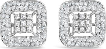 Delicately crafted in radiant 10K white gold with a shimmering rhodium finish, these exquisite stud earrings epitomize sophisticated elegance. At their heart, each earring features a stunning composite of nine princess-cut diamonds, meticulously invisible-set to present a flawless expanse of brilliance. This dazzling core is artfully encircled by a halo of scintillating round diamonds, enhancing the light-catching potential with every turn of the head. The thoughtful spacing between the central and peripheral diamonds imbues the piece with a refreshing lightness, making it a versatile addition to any attire, from daytime chic to evening glamour. Secure push backs ensure comfort and stability for continual wear.