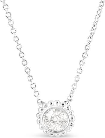 Count on this striking piece to stand out in a sea of diamond pendant necklaces. Unlike the typical design, the cable chain is cinched to one 1/2 cttw natural round diamond that’s fixed in a bezel setting and surrounded by 10K white gold details, giving it a sunflower-inspired finish. A spring ring clasp completes the design. Let it adorn your decolletage when you’re wearing a deep V-neck top.