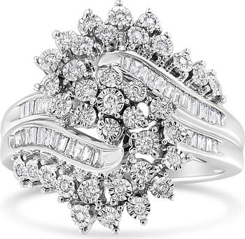 Feminine and sophisticated, this beautiful white diamond floral ring is the perfect gift for you or for the special lady in your life. This 10k white gold piece has a unique "s" shaped motif embellished with natural, round-cut diamonds. The band is further set with beautiful baguette-cut diamonds. The ring has a total carat weight of 1/2 c.t., making it the perfect addition to your jewelry collection. Add a touch of dazzling glamour to your outfit with this stunning white gold and diamond bypass cocktail ring!