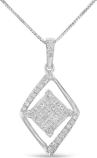 This geometric double rhombus necklace is set with 1/3 cttw of natural, beautiful diamonds. Sure to shine on your neck, this pendant is designed with the finest 10k white gold. Boasting a total diamond weight of 1/3 cttw, this piece will be a standout in your jewelry collection. Comes with an 18" box chain.