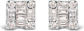 10K White Gold 1/7 Ct Round and Baguette Diamond Mosaic Square Stud Earrings