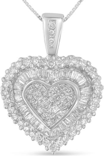 Let your love life touch the new heights of romance by giving her this beautiful diamond heart pendant. Encrusted with pave-set diamonds in multi-cuts the polished pendant is covered with white diamonds, which are princess, baguette, and round. Further, the ten karats white gold is graceful and glossy that will lend a versatile look over this startling necklace.