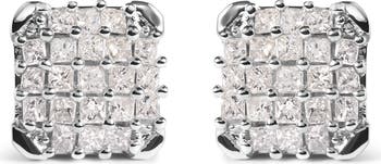 Indulge in the exquisite beauty of these 10K white gold diamond composite stud earrings. Adorned with 42 natural princess diamonds, these earrings boast a total weight of 3/4 cttw. The open frame design adds a touch of elegance, while the prong setting ensures the diamonds shine brilliantly. Featuring push back earring findings, these earrings are perfect for everyday wear or special occasions. With a color grade of I-J and clarity grade of I1-I2, these earrings are sure to make a statement. Treat yourself or someone special to the luxury of these stunning diamond earrings.