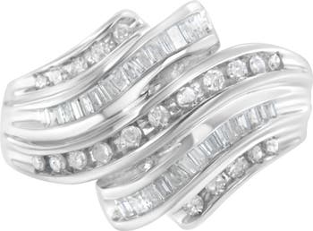 A diamond band that glistens with five rows of alternating channel set round and baguette diamonds in a serpentine shape. The band is crafted in cool 10 karat white gold and has a total diamond weight of 3/4 carats.
