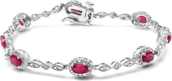 Behold this stunning link bracelet, fit for a queen. Crafted from lustrous 10K white gold, it features eight natural heat treated red rubies, each elegantly cut into an oval shape measuring 4.5mm x 3mm. The rubies are perfectly complemented by eight sparkling round diamonds with a total weight of 0.05 cttw. These diamonds, with their H-I color and SI1-SI2 clarity, are set in prongs to ensure maximum brilliance and fire. This exquisite bracelet measures 7 inches in length and is designed to fit snugly on a woman's wrist. It boasts a unique link design that allows it to drape gracefully around the wrist, creating a luxurious and eye-catching effect. The bracelet is finished with a secure box clasp, ensuring that it stays firmly in place. This ruby and diamond link bracelet is the perfect choice for anyone seeking to add a touch of elegance and sophistication to their jewelry collection. Whether worn alone or paired with other pieces, it is sure to turn heads and draw compliments.