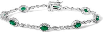 10K White Gold Oval Green Emerald & Diamond Alternating Link Bracelet