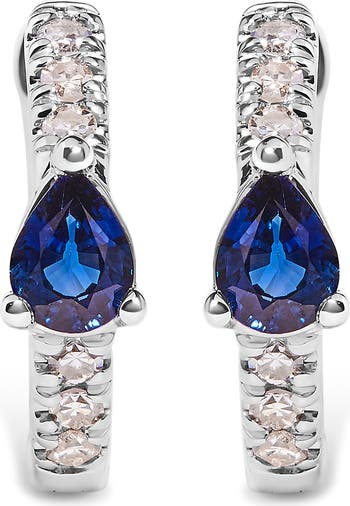 10K White Gold Pear Shaped Blue Sapphire and 1/10 Ct Diamond Huggy Hoop Earrings