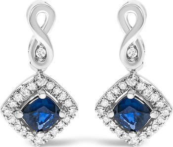 10K White Gold Sapphire and Diamond Halo Cushion Shaped Drop Earrings