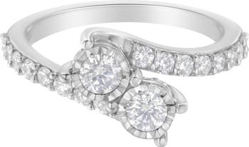 Celebrate your life together with this exquisite two-stone diamond ring. Crafted in 10k white gold, this exquisitely crafted design features two 1/5 ct. diamonds set in miracle plating, representing both your friendship and loving commitment, nestled side-by-side. The gracefully bypassing shank glistens with smaller round accent diamonds and wraps the center duo in a sparkling embrace. A brilliant metaphor for your romantic love story, this ring captivates with 1 ct. t.w. of diamonds and a bright polished shine.