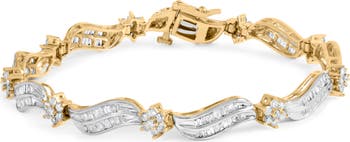 Indulge in luxury with this stunning 10K yellow and white gold bracelet, boasting a breathtaking 3.00 cttw of natural diamonds. With a total of 243 round and baguette diamonds, this piece is a true masterpiece, shining bright with I-J color and I1-I2 clarity. The unique wave link design adds a touch of elegance and sophistication to any outfit. Expertly crafted with prong and channel settings, this bracelet is sure to last a lifetime. Perfect for the modern woman who loves to make a statement, this bracelet is secured with a box clasp for added convenience. Elevate your jewelry collection with this exquisite diamond cluster and wave link bracelet.