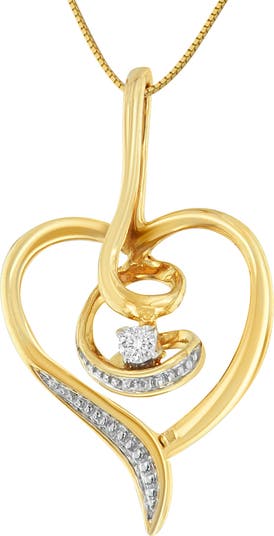 Symbolizing a love that never ends, this impeccably designed real 10kt gold heart pendant swirls at the center and sparkles with a scattering of diamonds. It's a classic romantic surprise she'll want to show off every day. This necklace makes a perfect Valentine's Day gift, or as a novel twist on a promise ring. Wear this understated, yet elegant necklace as a signature everyday piece, or choose it to dress up any evening attire.