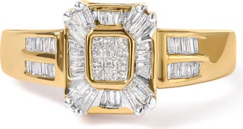 Crafted with love and attention to detail, this captivating piece is destined to become a cherished treasure in your collection. The lustrous 10K yellow gold provides a radiant backdrop for 50 natural diamonds, meticulously arranged to create an awe-inspiring composite and halo design. Within this ensemble, 38 baguette diamonds and 12 princess-cut diamonds harmoniously unite, boasting a total weight of half a carat. The H-I color grade ensures a captivating brilliance that catches the eye, while the SI1-SI2 clarity grade ensures a mesmerizing display of natural beauty. Each diamond is securely held in a combination of channel and bezel settings, allowing them to shine and sparkle with every movement of your hand. With its enchanting design, it effortlessly adds a touch of sophistication to any outfit, whether for a special occasion or as a daily statement of elegance.