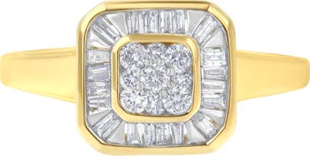A diamond cocktail ring that has a central squared cluster of round brilliant cut diamonds surrounded by a halo of baguette diamonds. The wide tapering band is crafted in warm 10 karat yellow gold. The ring has a total diamond weight of 1/2 carat.