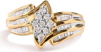Step into a world of timeless beauty with our 10K yellow gold fashion ring. Crafted with meticulous attention to detail, this exquisite piece is destined to become a cherished treasure in your collection. Set in radiant 10K yellow gold, a captivating cluster of 39 diamonds adorns the ring, including 9 brilliant rounds and 30 dazzling baguette-cuts. With a total weight of 1/2 carat, these diamonds radiate a scintillating brilliance that catches the eye. The H-I color grade ensures a captivating display of light and sparkle, while the I1-I2 clarity grade adds a touch of natural allure. Each diamond is skillfully set in a combination of prong and channel settings, creating a harmonious balance of elegance and security. The cluster head design draws inspiration from nature's beauty, creating a mesmerizing centerpiece that captures the essence of your inner radiance.