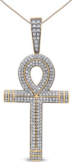 Celebrate life with this spellbinding diamond pendant necklace for men! Fashioned in genuine 10K yellow gold, this renowned design features a sculpted ankh cross shape encrusted with a gleaming collection of 260 round diamonds in prong-settings. The ankh is an ancient Egyptian hieroglyphic that symbolizes life and is recognizable as a talisman often held by gods and pharaohs. This regal silhouette features a total 7/8 cttw diamonds of an approximate H-I color and SI1-SI2 clarity. No chain is included.