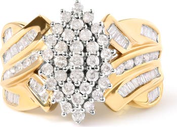 Indulge in the enchanting allure of our 10K Yellow Gold Diamond Pear Shaped Cluster Cocktail Ring. Embrace the brilliance of natural diamonds, carefully selected for their exquisite radiance. Adorned with a total of 85 diamonds, this stunning ring showcases a harmonious blend of 45 round and 40 baguette-cut diamonds. Each diamond meticulously set in a combination of prong and channel settings, forming a breathtaking cluster that sparkles with every movement. With a generous 1.0 Cttw diamond total weight, this ring exudes luxury and glamour. The diamonds, ranging in H-I color, emit a radiant glow, while the I2-I3 clarity enhances their unique character. Embrace the elegance and prestige that our Diamond Pear Shaped Cluster Cocktail Ring offers. A symbol of refined taste and sophistication, this remarkable creation will leave you in awe with its extraordinary craftsmanship and the timeless allure of diamonds.
