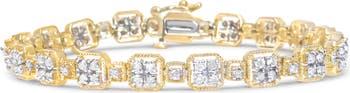 Showcasing a glamorous look to illuminate your every style choice, this stylish link bracelet features an array of shimmering diamonds in a square silhouette for a modern edge. This sophisticated design showcases square-shaped links of alternating sizes, each outlined with intricate milgrain borders. The larger boxed squares feature four, prong-set round diamonds, while the smaller squares each feature just one diamond. This geometric motif is certain to elevate your style and mood with its sparkling array of diamonds of which total 2.0 cttw and hold an approximate J-K Color and I2-I3 Clarity. Crafted of genuine 10k yellow gold, this elegant piece fastens securely with a box with clasp. It is 7.25 inches long, best for small and medium sized wrists.