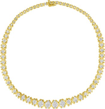 This gorgeous riviera statement necklace is created in the finest 10k yellow gold. Boasting a glamorous appearance, this beautiful piece is embellished with yellow gold "X" links and clusters of stunning round-cut diamonds in pave settings. 4 ct tdw of natural diamonds sparkle from this necklace, and is the perfect extravagance you've been looking for.