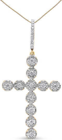 A powerful symbol of faith and belief, this men's cross pendant necklace is studded with glittering round diamonds in miracle settings, forming the instantly-recognizable cross silhouette. These diamonds dazzle from warm 10k yellow gold, catching and reflecting the light for that eye-catching style. This pendant necklace features a total 5/8 cttw diamonds of an approximate H-I color and SI1-SI2 clarity. No chain is included.
