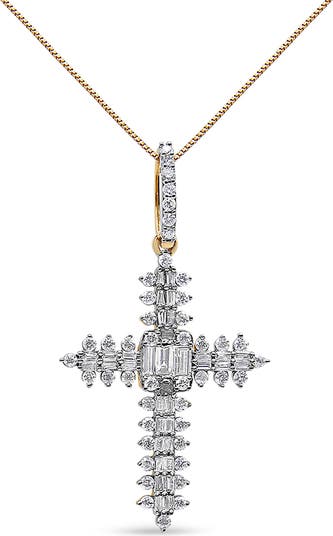 Embrace your faith with this sparkling diamond cross pendant necklace for men that symbolizes light and goodness. A dramatic presentation of round and baguette diamonds in prong settings sets this pendant ablaze with a light-catching splendor in a cross silhouette. These diamonds also extend to the bail for added shine. The genuine 10k yellow gold embraces these fine stones and this metal will also stay tarnish-free for years to come. The diamonds are a total 7/8 cttw with an approximate H-I color and SI2-I1 clarity. No chain is included.