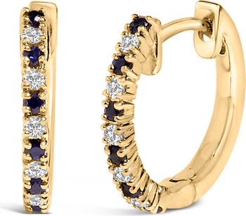 10K Yellow Gold Alternating Blue Sapphire 1/10 Ct Diamond Huggy Hoop Earrings