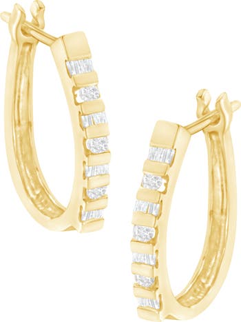 You will fall in love with these unique hoop earrings. A must have for any serious jewelry collection, these 10K gold earrings boast an impressive 0.25 carat total weight of diamonds with 22 individual stones. The oblong hoops have alternating, channel set rows of baguette cut diamonds and round, brilliant cut diamonds lining the outside face of the hoops. The hoops have hinged, snap-down leverback closures for ease of wear. This authentic design is crafted of your choice of real 10 karat white or yellow gold, a precious metal that will keep a tarnish-free shine for years to come. These bold horseshoe shaped hoop earrings make a great gift for any special occasion! Whether worn for daytime glamour or evening sparkle, these earrings are gorgeously versatile. Give her a gift that will perfectly complement her favorite ensemble.