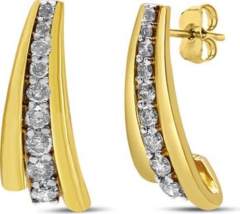 Light up the room in these dazzling huggie earrings for her. This pair of stud earrings is styled for length in a downward swish with a gradual increase of the diamond size for a look that sizzles with sophistication. The sparkling prong-set diamonds total 1.00 cttw and are of an approximate I2-I3 Clarity and I-J Color. The 10k yellow gold plated .925 sterling silver adds another layer of elegance to this look. These pierced earrings secure in the ear via push back findings.