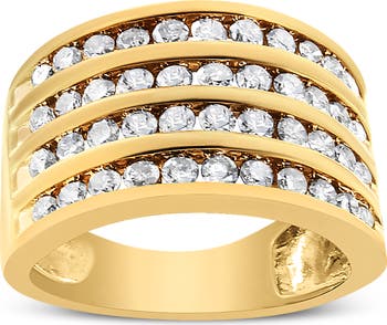 A perfect addition to your everlasting jewelry collection, this 4 row band is crafted in genuine .925 sterling silver and plated with 10k yellow gold, a metal that will stay tarnish free for years to come. Boasting an impressive total carat weight of 1 1/2 c.t., this ring has 4 rows of brilliant, round-cut diamonds in a unique channel setting. Add a touch of sparkle to your formal wear with this beautiful ring!