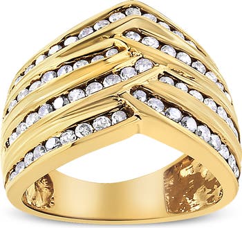 Treat yourself to this modern and charming channel set diamond band and elevate all your looks! This beautiful ring is created in genuine .925 sterling silver and plated with 10k yellow gold, a metal that will stay tarnish free for years to come! Sparkling, natural round-cut diamonds are inlaid in distinct horizontal rows on the band. The rows intersect in an upward design, giving the ring a more complex feel. This ring has a total carat weight of 1 1/2 c.t., thus adding a touch of shine to outfit!